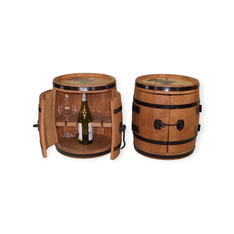 Beczkę można zamówić tylko na indywidualne zamówienie, ponieważ musimy wiedzieć co Państwo chcą umieścić w środku (np. butelkę wina z kieliszkami, czy butelkę whisky ze szklankami). Pod zawartość projektujemy półkę wewnętrzną.