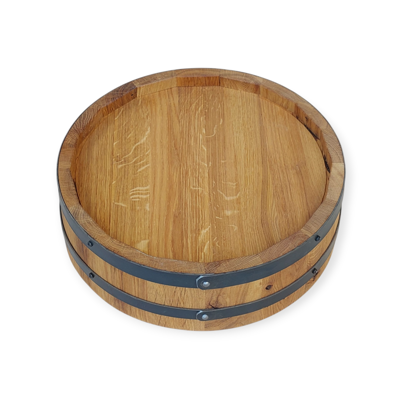 Front wykonany z drewna dębowego przez doświadczonego bednarza. Złożony z klepek, ściśniętych metalowymi, ręcznie nitowanymi obręczami. Korpus i dno wykonane są z drewna litego. Całość została sklejona wysokiej klasy klejem wodoodpornym, następnie wyszlifowana i zaimpregnowana olejem lnianym. Obręcze zostały przymocowane na wkręty. Na życzenie klienta wyrób może być wybarwiony na ustalony kolor. W standardzie obręcze wykonane ze stali czarnej. Istniej możliwość wykonania obręczy ze stali ocynkowanej lub nierdzewnej. Istnieje możliwość domówienia stojaka, bądź piramidki z frontów. Możemy dołożyć imitację kranu.