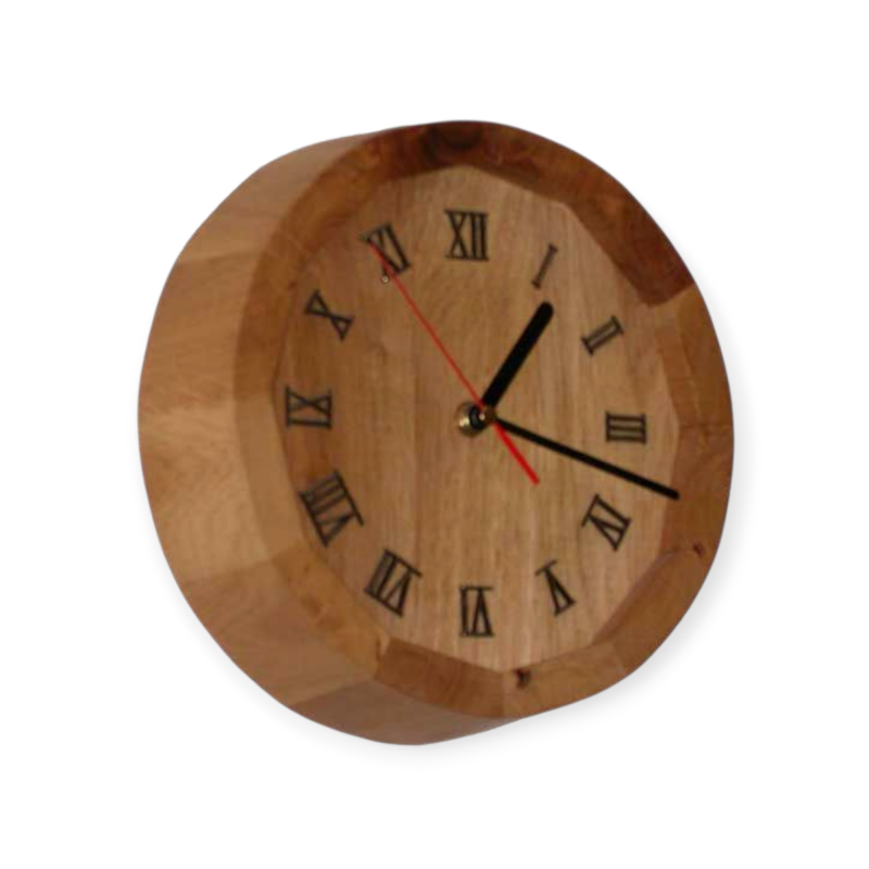 Drewniany zegar imitujący antałek, czyli dno beczki ze stojakiem świetnie nadaje się jako element reklamowy bądź dekoracyjny. Można powiesić go na ścianie. Posiada mechanizm kwarcowy ze wskazówkami. Cyferki mogą być przyklejane, wypalane laserem, bądź w formie dębowych kwadracików. Całość dopełnić może wypalenie loga laserem, druk uv, logo malowane farbą lub frezowaniem cnc. Zapraszam do wyceny brandingu.