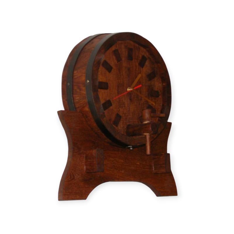 Zegar wykonany z drewna dębowego przez doświadczonego bednarza. Złożony z klepek, ściśniętych metalowymi, ręcznie nitowanymi obręczami. Korpus i dno wykonane są z drewna litego. Całość została sklejona wysokiej klasy klejem wodoodpornym, następnie wyszlifowana i zaimpregnowana olejem lnianym. Obręcze zostały przymocowane na wkręty. Na życzenie klienta wyrób może być wybarwiony na ustalony kolor. W standardzie obręcze wykonane ze stali czarnej. Istniej możliwość wykonania obręczy ze stali ocynkowanej lub nierdzewnej. Istnieje możliwość domówienia stojaka, bądź piramidki z frontów. Możemy dołożyć imitację kranu.