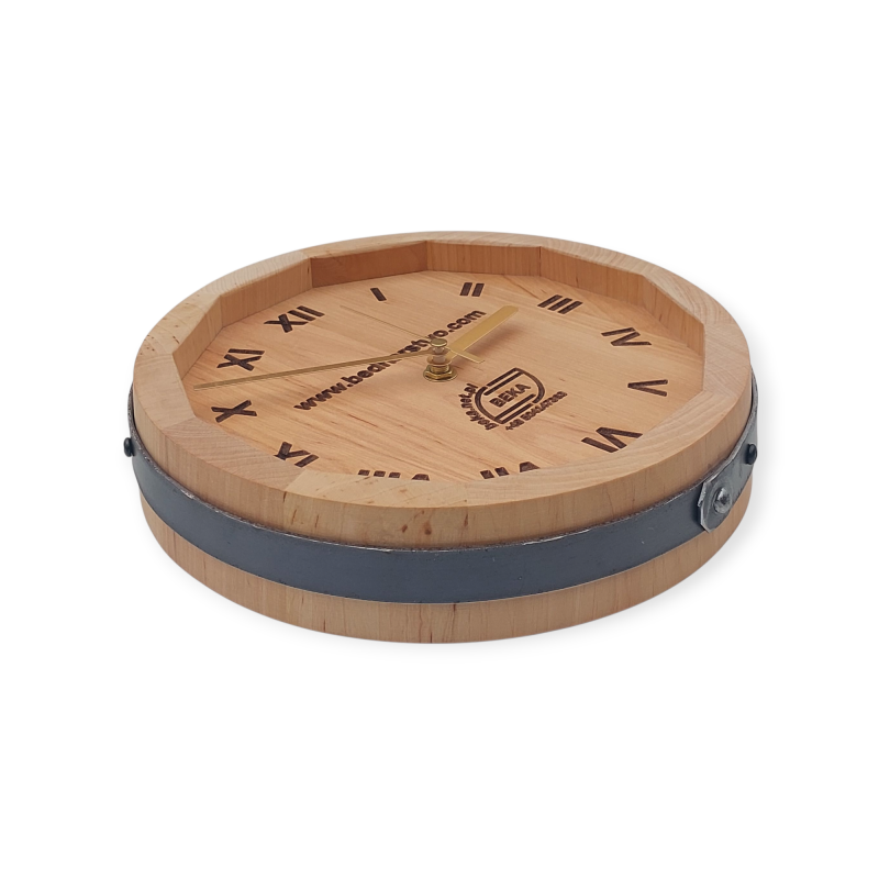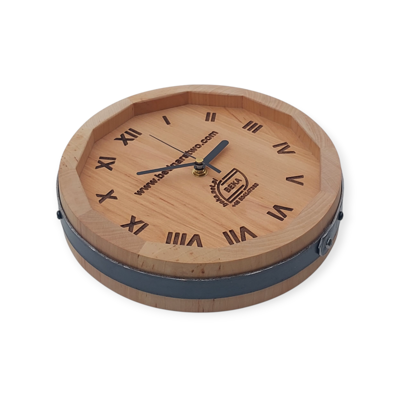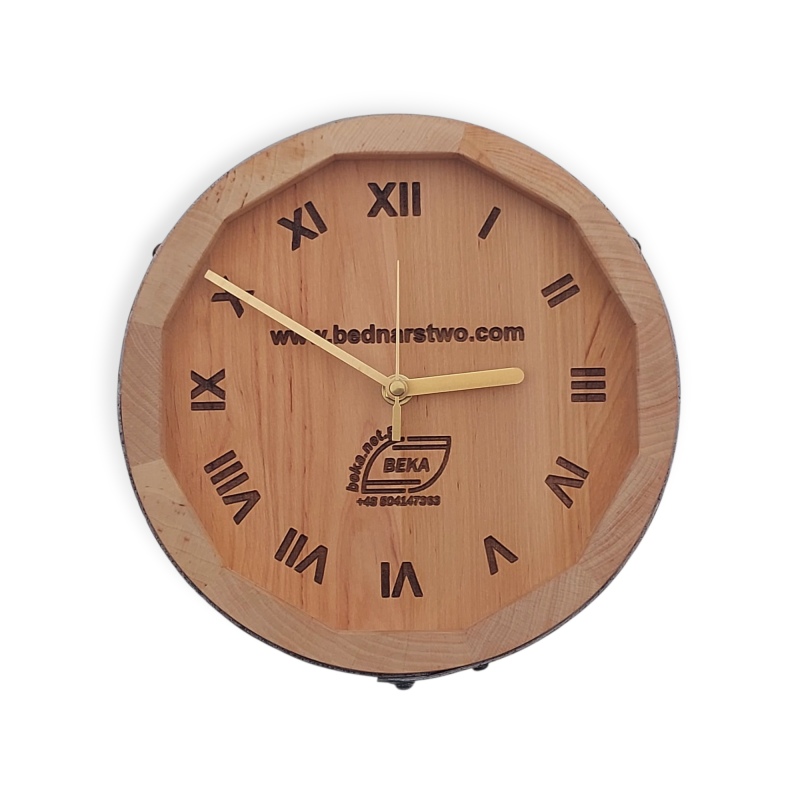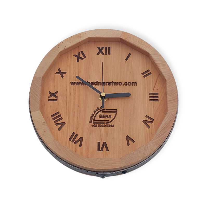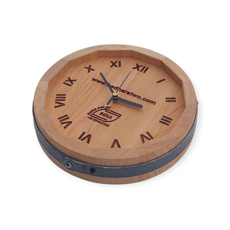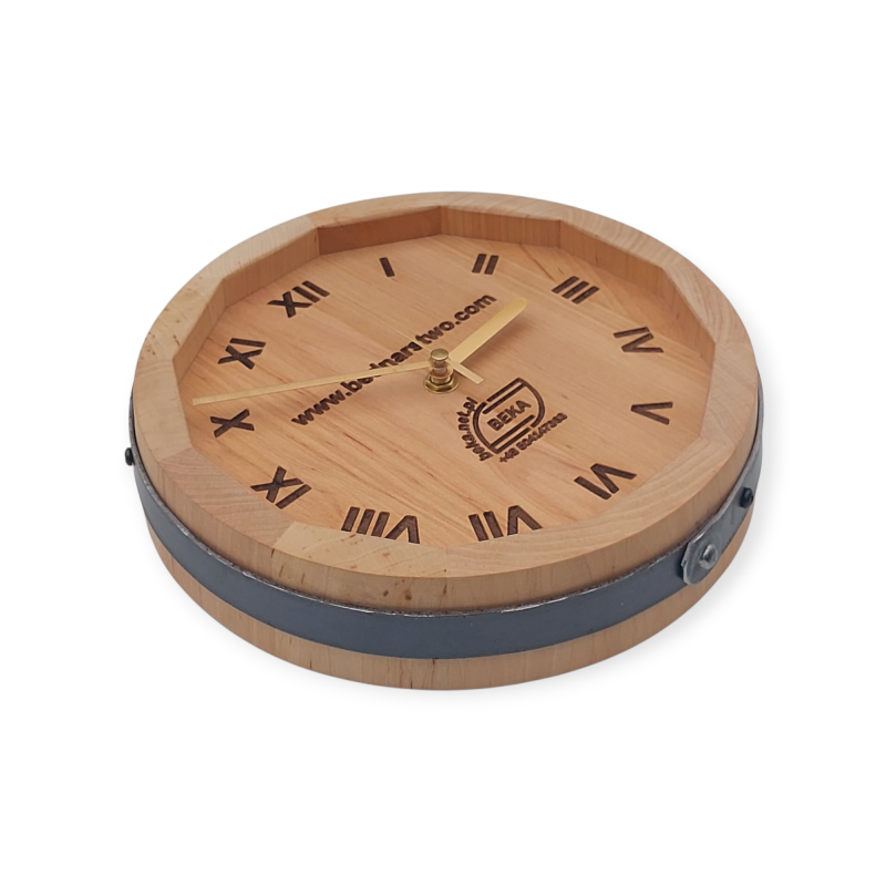 Drewniany zegar imitujący dno beczki świetnie nadaje się jako element reklamowy bądź dekoracyjny. Można powiesić go na ścianie. Posiada mechanizm kwarcowy ze wskazówkami. Cyferki mogą być przyklejane, wypalane laserem, bądź w formie dębowych kwadracików. Całość dopełnić może wypalenie loga laserem (do projektu potrzebujemy od Państwa pliki). Świetnie przykuwa wzrok, a dzięki grawerowi będzie promować Twoją markę bądź firmę.