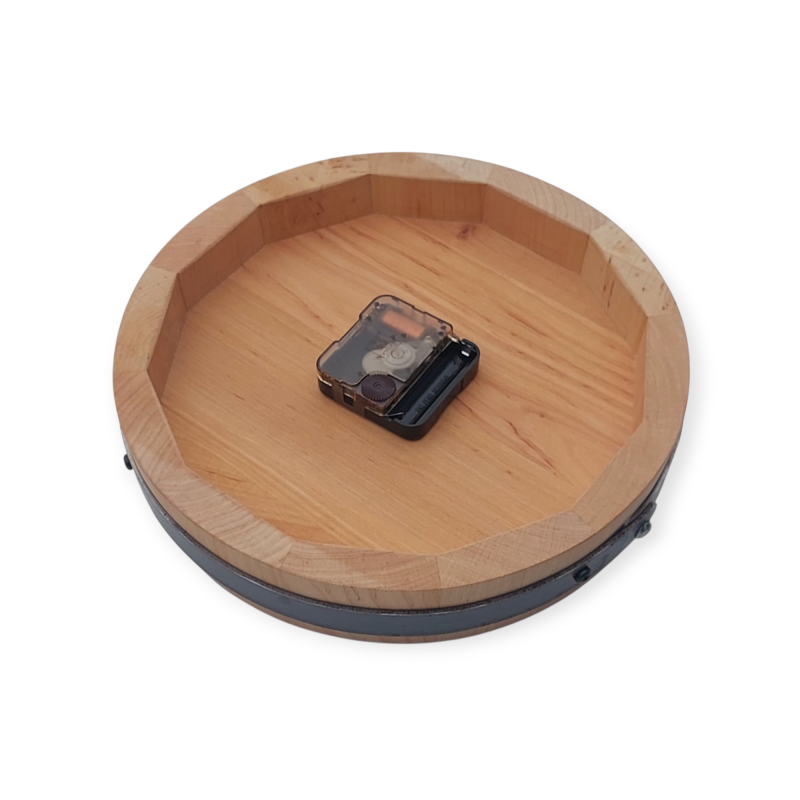 Zegar wykonany z drewna olchowego przez doświadczonego bednarza. Złożony z klepek, ściśniętych metalowymi, ręcznie nitowanymi obręczami. Korpus i dno wykonane są z drewna litego. Całość została sklejona wysokiej klasy klejem wodoodpornym, następnie wyszlifowana i zaimpregnowana olejem lnianym. Obręcze zostały przymocowane na wkręty. Na życzenie klienta wyrób może być wybarwiony na ustalony kolor. W standardzie obręcze wykonane ze stali czarnej. Istniej możliwość wykonania obręczy ze stali ocynkowanej lub nierdzewnej.